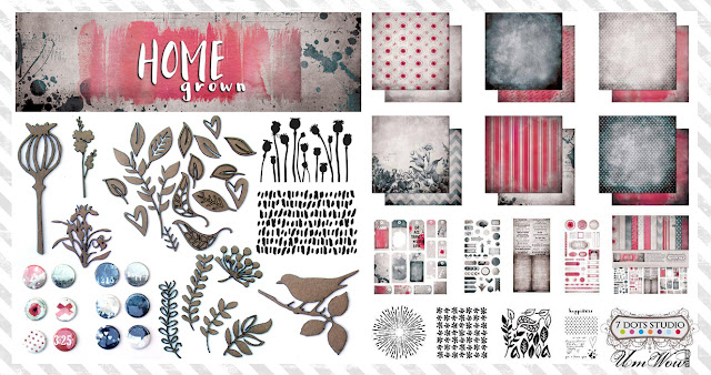 I love a grid design! It's great for adding a whole lot of embellishments. I chose a grid design patterned paper from the Starshine collection from Shimelle, and I knew it would work perfectly for adding lots of the fun chipboard pieces from UmWowStudio.