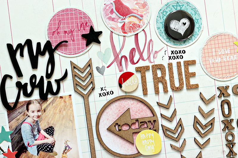 and I wanted a way to use as many of the chipboard pieces as possible. So I thought it would be fun to use the pieces to create the word Love on my layout. I used the large arrow from the Chevron Arrow chipboard with a mix of the XOXO Mash chipboard.